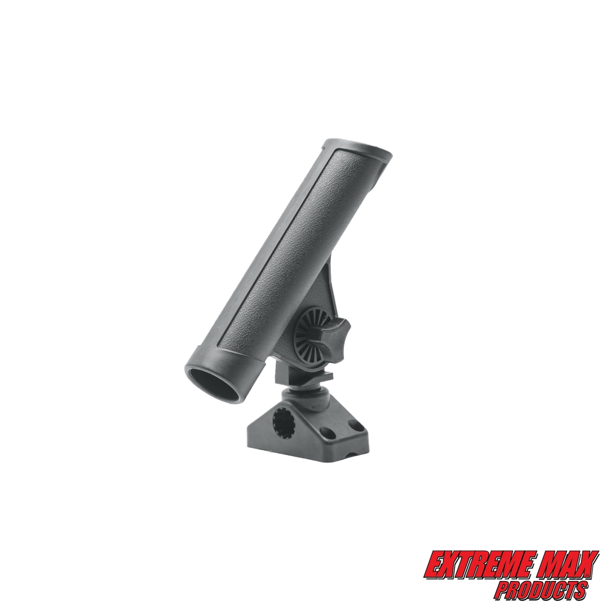 The Extreme Max 3006.8627 Adjustable Fishing Rod Holder for Kayaks with Rotating Fixed Mount is compatible with most rods, reels, spinning reels, open-faced reels, baitcasters, and more. The holder's post is designed to be mounted at any fixed angle and the angle can be adjusted at the base, letting you fully customize to your setup. The base attaches to any flat surface or track base, such as a boat gunwale or the Extreme Max aluminum Slider Base and nylon Slider Trax series bases.