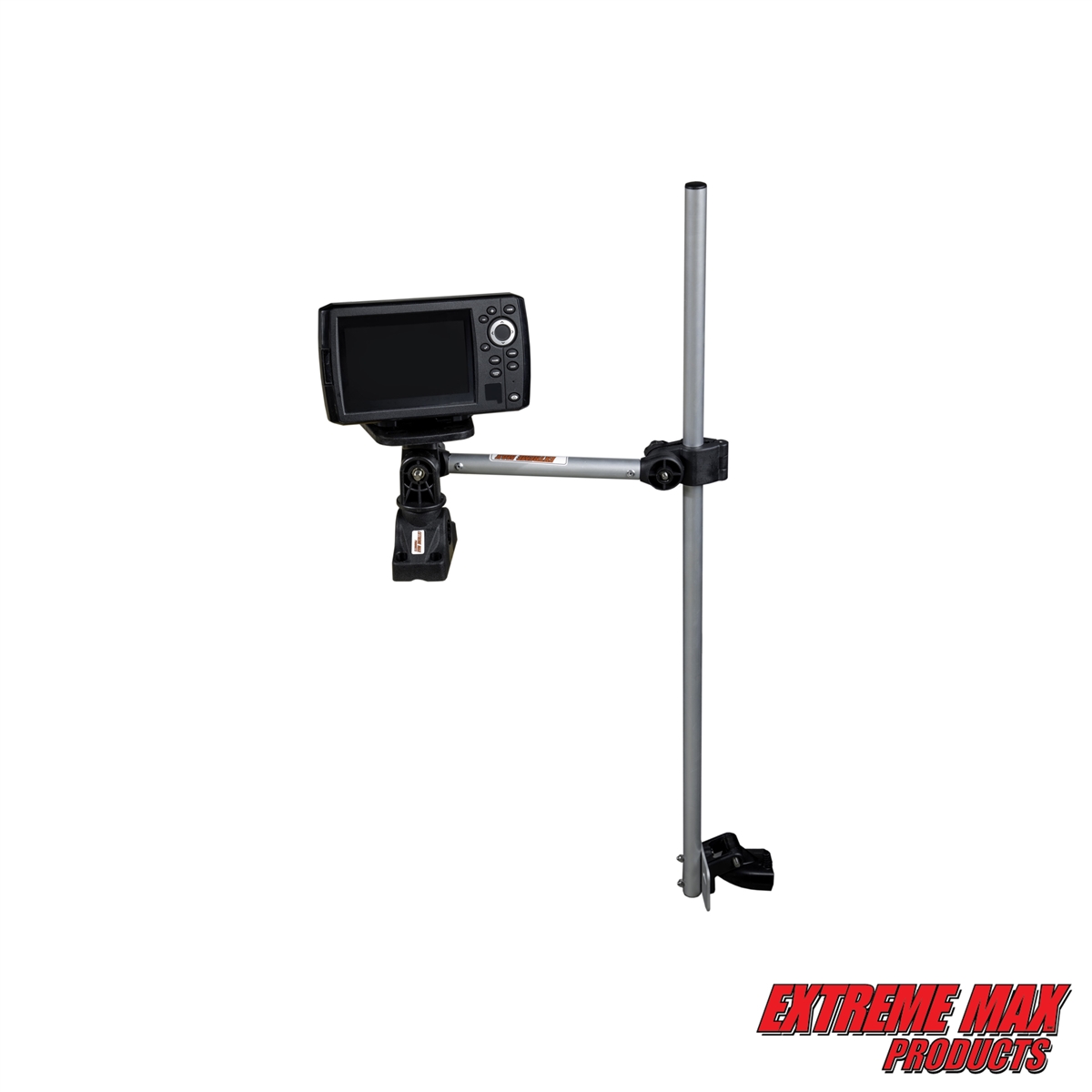 The Extreme Max 3006.8649 Portable Rod Holder Mount Adjustable Transducer Bracket mounts to existing fishing rod holder brackets, but also includes a new locking rod holder bracket for new installations if needed. The bracket features a quick-release for easy installation and removal during travel and storage. The bracket offers a universal head unit mounting plate and universal transducer mounting plate that work seamlessly with most head units and transducers found today. The bracket features a range of adjustability in the head angle plate, transducer height, and distance over the boat rail. The base attaches to any flat surface or track base, such as a boat gunwale or the Extreme Max aluminum Slider Base and nylon Slider Trax series bases. Designed for use at trolling speeds only.