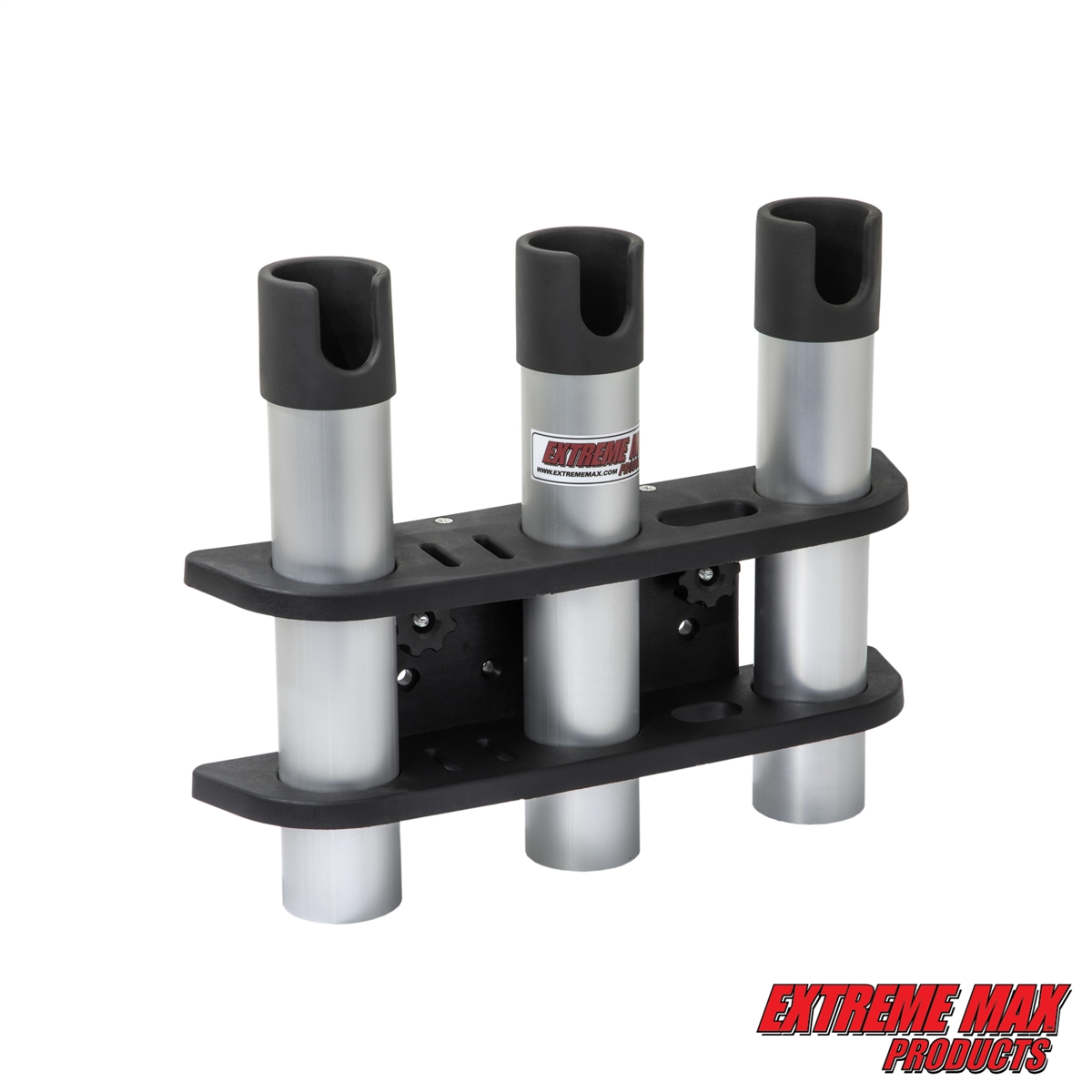 Keep all your rods ready in one place! Mounting directly into your Tracker's Versatrack system, the 3-rod holder features three durable aluminum rod holders, perfect for transferring your gear to and from your favorite fishing hole. Slotted rubber caps on each rod tube hold the rods steady while protecting the rod from abrasions and scratches caused by boat vibrations and rough water. The holder also includes tool slots to store your fishing knives, a pair of scissors, extra lures, and more. The unit's oversized plastic knobs make it easy to install, remove, and move around your track system to set you up in that perfect spot.
