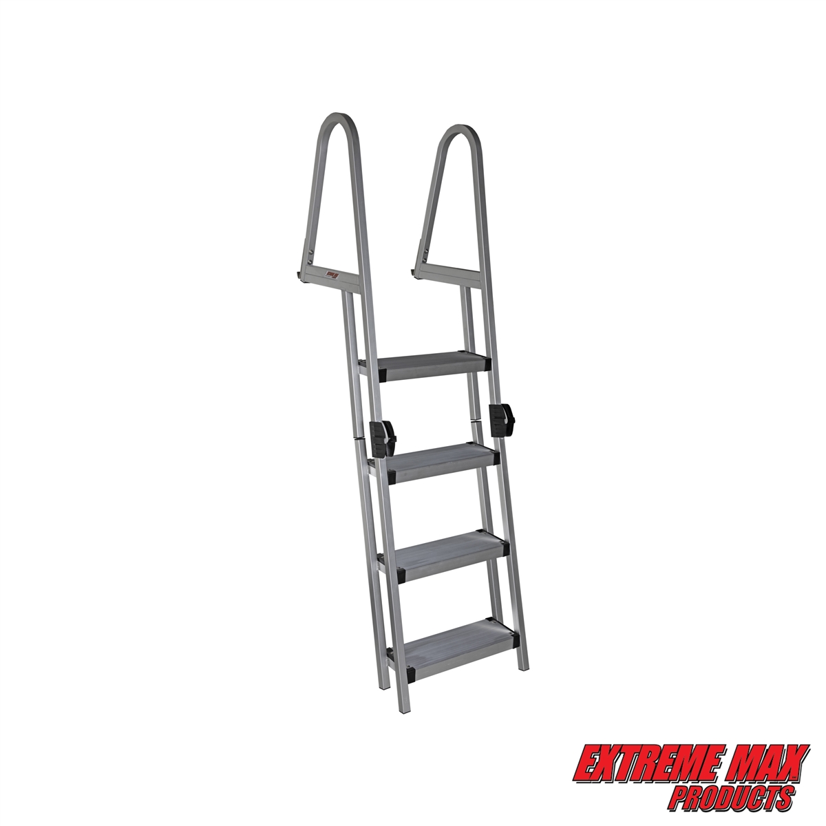 Board your pontoon, dock, or floating raft with ease using the Extreme Max Pontoon and Dock Ladder! Its angled design and extra-wide steps ensure safe and comfortable access, even in deep water. Installation is a breeze - mount it to your pontoon, dock, or floating raft in under five minutes, and with additional mounting hardware, you can easily switch between all three applications. The simple and secure mounting system allows for quick relocation, making setup and storage a snap. When not in use, the ladder's steps fold up to minimize storage space. Stainless steel mounting hardware is included. Intended for use in freshwater applications; oxidation may occur in brackish and saltwater. Two-year replacement warranty.